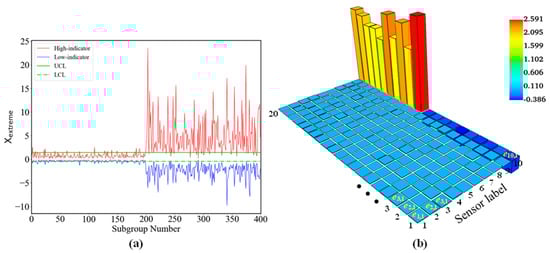 The author substitutes the simulated sensor damage data generated by the above methods into the proposed diagnostic method and draws a control chart. The generalized likelihood ratio matrix S can be used to locate damaged sensors or structural damage locations. Because of the large number of test data, the positioning matrix E is introduced for easy expression. See Equation (26) for the calculation formula of E. The identification effect of the diagnosis method proposed in this paper for Sensor damage is shown in Figure 5. Figure 5b identifies the damaged sensor label (No. 10 sensor). The measurement results of damaged sensors can be replaced by the measurement results of other healthy sensors. Equation (4) can calculate the measurement results of the replaced sensor. The change in each indicator after the damaged sensor is replaced is shown in Figure 6. As mentioned above, the authors made the same treatment for the data of structural damage. The authors have drawn relevant figures, as shown in Figure 7, Figure 8 and Figure 9.