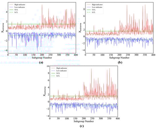 The indicator matrices A and B reflect the state of the sensor system output in the corresponding period. After the indicator matrices are calculated, this paper draws a control chart of the sensor system principal component scores. In the control chart, it can be displayed whether the principal component score of the sensor system output exceeds the limit.