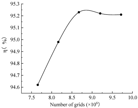 In this study, CFX was used to simulate the flow field in the turbine, and the fluid domain of each component of the turbine was meshed by Meshing. The volute, runner, and draft tube are meshed by tetrahedral grid, and the stay vane and the guide vane are meshed by the hexahedral structured grid. In order to verify the grid independence, five sets of grid schemes were created, with the total number of grids being 7,654,027, 8,163,698, 8,672,402, 9,201,632, and 9,717,968, respectively. It can be seen from Figure 2 that the efficiency tends to smooth out as the number of grids increases, and the third set of grid schemes was selected for simulation considering the computational speed and resources, The number of grids of volute, stay vane, guide vane, runner, and draft tube is 1,279,176, 557,296, 247,968, 5,019,628, and 1,568,334, respectively, and the y plus of the first layer is less than 1. The specific division results are shown in Figure 3.