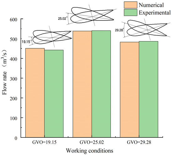 In order to study the influence of different openings of the guide vane on the internal flow characteristics of the runner, the openings under three rated output conditions were selected, namely, the opening corresponding to the maximum head GVO = 19.15, the rated opening GVO = 25.02, and the maximum opening GVO = 29.28. The efficiency of the turbine corresponding with three different openings is 92.89%, 95.23%, and 90.95%, respectively. The comparison of real machine and simulated data is shown in Figure 5, and the simulation error is less than 2%.