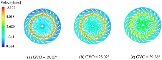 Turbulent kinetic energy (TKE) can more intuitively reflect the stability of the flow of the runner. Figure 7 shows the TKE distribution in the guide vane channel and the runner. It can be seen from the figure that the larger TKE is mainly concentrated in the high-speed flow [14,15]. Under the condition of a 19.15° opening, due to the influence of dynamic and static interference, the larger turbulent kinetic energy appears in the vaneless area and the connection of the guide vane channel and the runner channel, where the hydraulic loss is larger. Under the condition of 25.02° opening, the TKE is small as a whole, and there is no obvious phenomenon of TKE concentration. It can be seen that the flow under this condition is relatively stable, and the hydraulic loss is small. Under the condition of 29.28° opening degree, compared with the other two conditions, the TKE of the vaneless area and the connection between the guide vane flow channel and the runner flow channel is smaller. In addition, due to the instability of the internal flow of the runner, there is a local high TKE at the inlet near the pressure surface of the runner blade. The inlet flow of the runner has a slight flow separation near the pressure surface of the blade, resulting in a local trace hydraulic loss. Through the above analysis, when the opening of the guide vane is 25.02°, the internal flow of the runner is the most stable and the hydraulic loss is the smallest.