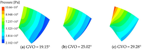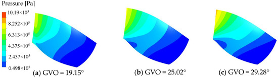 - Under the condition of GVO = 19.15°, the vortex in the runner mainly appears near the suction surface and gradually evolves from the runner inlet to the outlet. Under the condition of GVO = 25.02°, there are few vortex areas, and the small vorticity vortex area evolves from the blade near the outlet to the blade passage area. Under the condition of GVO = 29.28°, due to the large impact between the incoming flow and the blade pressure surface, a large vorticity vortex area appears near the blade pressure surface, and the vortex evolves from the runner outlet area to the inlet.