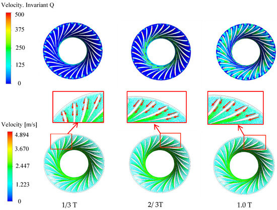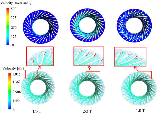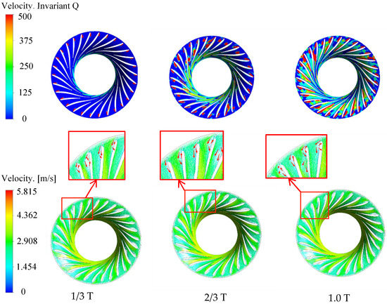 The internal vortex of the runner will have a certain interference effect on the mainstream of the runner, resulting in instability, such as energy dissipation and flow separation. In this study, the Q-criterion is selected to identify the internal vortex of the runner. Q-criterion is used to characterize the streamline of fluid after deflection. Large vorticity often occurs where the Q-criterion is large [16,17]. The vortex and velocity vector distributions are taken at the flow surface of the runner 1/2 blade height. By observing the velocity distribution and vortex distribution of the runner flow channel, the internal flow regime of the runner is qualitatively analyzed, and the distribution and evolution law of the internal vortex of the runner under different opening conditions are obtained.