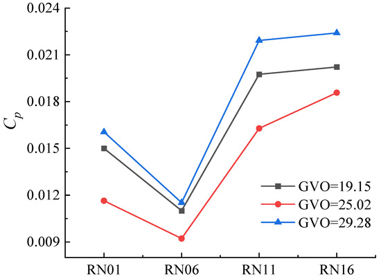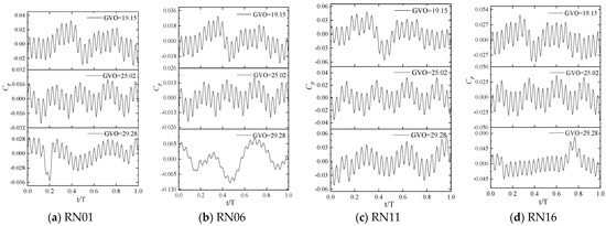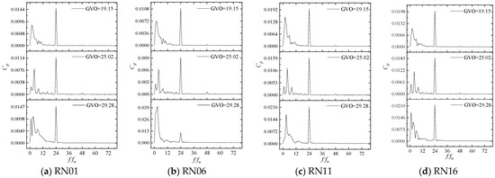 Four monitoring points, RN01, RN06, RN11, and RN16, near the runner inlet are selected. The pressure values of these monitoring points are extracted, then converted into the pressure pulsation coefficient Cp to form the time domain signal. Finally, the time domain signal is converted to the frequency domain signal by Fast Fourier Transform (FFT), and the pressure pulsation of the monitoring points under different opening conditions are shown in Figure 15 and Figure 16.