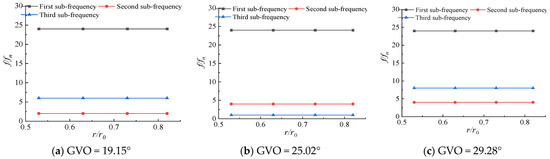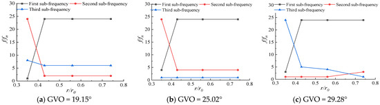 The pressure pulsations at different positions inside the runner are different. In order to explore the pressure pulsation changes from the inlet of the runner to the outlet of the impeller, the first sub-frequency and the first and second frequencies of each monitoring point at different openings are shown in Figure 18 and Figure 19. The runner radius is denoted as r0, and the flow surface of RN12~RN15 is denoted as flow surface I, which is located near the long blade and is 0.74r0, 0.56r0, 0.43r0, and 0.35r0 away from the center axis of the runner, respectively. The flow surface of RN17~RN20 is denoted as flow surface II, which is located near the short blade, and the distance from the central axis is 0.82r0, 0.73r0, 0.63r0, and 0.53r0, respectively. From the frequency diagram, it can be seen that the first sub-frequency of the monitoring points on the flow surface I at different openings is basically 24fn. Only the first sub-frequency of the monitoring point RN15 at the three openings is fn, 4fn, 3fn, and 24fn appears in the first sub-frequency or the second sub-frequency, mainly because the monitoring point RN15 is the farthest from the runner inlet, and the pressure pulsation at this point is the least affected by the dynamic and static interference, and other frequencies perform a leading role in the pressure pulsation; the first sub-frequency of the monitoring point of the flow surface II at different openings is 24fn. The first sub-frequency and the second sub-frequency become the frequency doubling of other axes as the opening changes. The pressure pulsation near the short blade is dominated by the dynamic and static interference. It can be seen that the farther away from the runner inlet, the less obvious the leading role of the dynamic and static interference in the pressure pulsation, and the greater the influence of the unstable flow inside the runner.