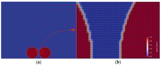 A geometric model was employed in this study. Two cavitation bubbles of the same size were placed on the wall of a stationary flow field, with an initial cavitation bubble radius of 1 mm. The calculation domain was a two-dimensional space, with the cavitation bubble-attached wall being a no-slip wall, and the left and right boundaries being solid walls. To eliminate the influence of other computational domain boundaries on the cavitation collapse bubble process, the calculated domain edge length was set to 50 times of the initial cavitation bubble radius. A structured grid was used, which was locally refined in the key areas of cavitation bubble collapse and jetting. Figure 1 shows the grid division and local magnification of the double-cavitation bubble collapse calculation domain: (a) shows the initial position of the cavitation bubbles, and (b) is the magnified schematic diagram of the red box, where red represents vapor, blue represents water, and white represents the gas–liquid interface, respectively.