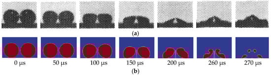 In the controlled experiments, cavitation bubbles were carefully positioned on the surface of the upper pressure transducer using a syringe. Two cavitation bubbles in symmetry were collapsed using a shock wave, with β = 2.2, and γ = 1, respectively. During the numerical simulation, the initial pressure inside the cavitation bubble was = 2300 Pa, the external ambient pressure was = 101325 Pa, and β and γ were the same values as under the experimental conditions, respectively. A comparison with the experimental results was conducted to verify the validity of the numerical simulation. The comparison results are shown in Figure 2. Figure 2a,b show the experimental and numerical simulation results, respectively. Regarding the entire collapse process, the near-wall double-cavitation bubble can be divided into three stages.