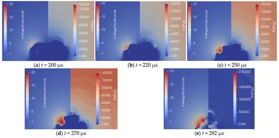 Figure 3 shows the velocity and pressure cloud diagrams at different moments of the double-cavitation bubble collapse. As shown in Figure 3a, at t = 200 μs, the cavitation bubble began to dent, and the jet started to form. During this time, the jet velocity was relatively low, and the cavitation bubble continuously emitted pressure waves to its surroundings. The wall pressure was relatively low, indicating that the pressure waves emitted towards the inner side of the cavitation bubbles were small. As shown in Figure 3b,c, the jet developed fully, and the velocity increased rapidly as a result. Pressure waves were emitted from both sides of the protruding cavitation bubble towards the outer side. As shown in Figure 3d, the jet penetrated the cavitation bubble and reached a maximum velocity of 25 m/s. The two annular cavitation bubbles radiated the two pressure-wave beams upward. As shown in Figure 3e, at t = 282 μs, the cavitation bubble reached its minimum radius, and the jet moved inwards in a tilted direction. The jet velocity began to decrease, and the water hammer impact was continuously released. A high-pressure area formed in the area between the annular cavitation bubble and the wall, which was caused by the combined action of the pressure waves generated by the water hammer and the cavitation bubble collapse. Owing to the presence of a high-pressure area, the annular cavitation bubble contracted rapidly, attaining a maximum contraction speed of 35 m/s.