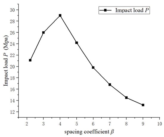 Relationship between the wall impact load and the cavitation bubble spacing coefficient β.