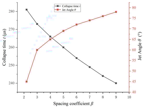 Relationship between the collapse time, jet angle, and the cavitation bubble spacing coefficient β.