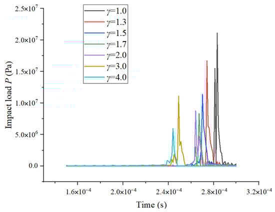 At the end of the collapse, the cavitation bubbles moved violently in the radial direction, were highly compressed, released energy in the form of shock waves, and finally formed an impact load on the wall. As the pressure waves generated by the cavitation bubble collapse propagated, the impact load on the wall gradually attenuated from the maximum value of due to energy dissipation with the increase in γ. At γ = 1.7, the wall impact load reached a minimum value of approximately 80 atm of pressure and then began of increase gradually. At γ = 3, the wall impact load reached a maximum value of approximately 110 atm of pressure, and when γ = 4, the wall impact load started to decrease again. Based on Figure 7, a mathematical model of the impact load P with respect to γ was established, as shown in Equation (17).