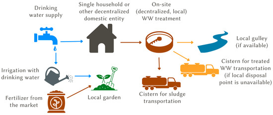 Wastewater is among the studied solutions for the mitigation of these threats. Wastewater is recognized as a source of both the needs of water and valuable materials [2]. While many promising achievements for reclaiming wastewater and extracting valuable materials at the municipality level have been reported, insufficient attention has been paid to areas with decentralized wastewater collection and treatment [3]. Typically, the decentralized management of wastewater includes an onsite treatment/collection facility, which periodically is emptied as shown in Figure 1.