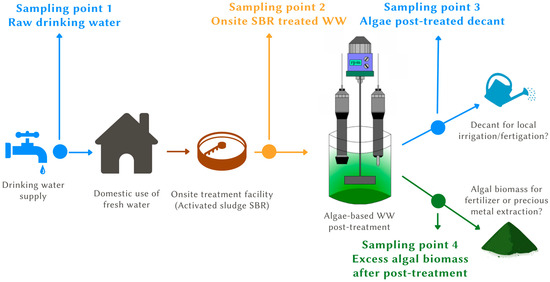 The process flow diagram is shown in Figure 2. Algae post-treatment was simulated in laboratory conditions, but wastewater was taken from an operating decentralized (single household) onsite treatment facility.