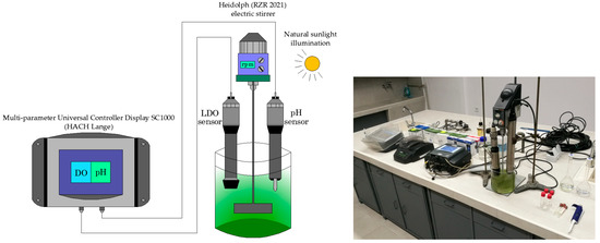 Both systems, reactor 1 and 2, operated with natural sunlight intensity, i.e., without an artificial light source. The approximate photoperiod was 14 h of solar illumination and 10 h of dark mode. The temperature of the water varied in the range of 19 °C to 33 °C. The components of each of the reactors were: (i) glass cylinders with D = 170 mm and H = 270 mm (used volume of approx. 4.5 L); (ii) Heidolph RZR 2021 (manufactured by Heidolph Instruments GmbH & Co. KG, Schwabach, Germany) electric stirrers (propeller size—B = 120 mm and H = 50 mm), set to 30–40 rpm; (iii) Multi-parameter Universal Controller Display SC1000 (manufactured by HACH Lange, Berlin, Germany) with a Luminescent Dissolved Oxygen (LDO) Sensor, a 1200-S pH Sensor, and a temperature sensor, recording the three parameter values hourly.