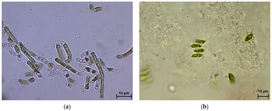 This strain was isolated from the high-alpine soils of Rila National Park (Bulgaria) and was cultivated as ACUS00207 in the Collection of Living Algae ACUS of the Sofia University “St. Kliment Ohridski” on standard Bold-Basal medium [38,39]—Figure 3. K. nitens is a green non-branched, uniseriate filamentous alga from the phylum Streptophyta, which grows in different types of habitats with a preference for the aero-terrestrial mode of life [40]. It has a large parietal trough-like plastid with one pyrenoid and reproduces by several means: vegetatively most often by the disintegration of the filaments, which ensures very fast replication, by division of cells in two daughter cells, or formation of peculiar enlarged resting cells (akinetes) or, rarer, asexually by zoospores [39,40]. Its potential for treating municipal wastewater was demonstrated in a study by Valchev et al., 2021 [41].