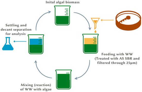 After the adaptation period, the actual experimental cycles (Figure 5) of the PSBR wastewater treatment process took place. The sequencing batch mode was selected to match the algae post-treatment with the biological onsite treatment facility (working in sequencing batch mode as explained above).