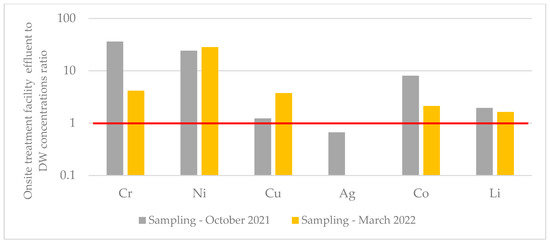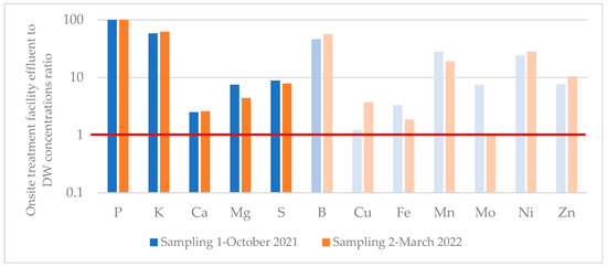 Based on these two sampling campaigns, the following might be concluded: (i) there is a relatively stable accumulation trend in these two measuring campaigns; (ii) all macro- and micronutrients increase in the treated effluent; (iii) the highest increase (more than 10 times) was measured for P, K, B, Mn, and Ni (Figure 6); (iv) valuable elements were accumulated in the treated effluent, so it is worth studying them further to assess the cost-efficiency of their extraction (Figure 7).