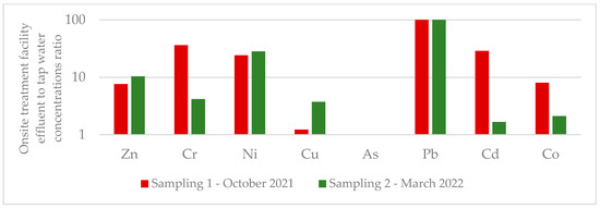 The measurements carried out at two sampling points—at the tap and at the outlet of the onsite treatment facility (Figure 2, sampling points 1 and 2)—are discussed in this section. Two sampling campaigns were carried out—in autumn (October 2021) and in spring (March 2022).