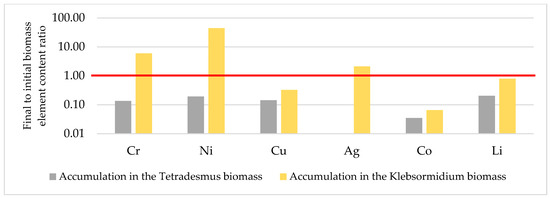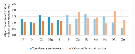 The element content in the algal biomass was measured: (i) at the beginning of the experiment (after the cultivation and before starting the trials with wastewater-treated effluent) and (ii) after approximately two months of operation of the photobioreactors. The final to initial ratios of each element in the biomass from the respective reactor are presented in Figure 10 in a logarithmic ordinate.