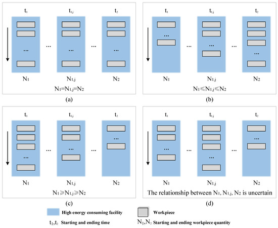 There is no change in the number of workpieces, as shown in Figure 2a. The workpiece weight can be denoted as . Meanwhile, the total processing time of this workpiece is denoted as . It is vital that the workpiece-processing time accounts for a part of the total processing time (). Therefore, the workpiece weight should be weighted at the time scale. The weighting process is as Equation (4):