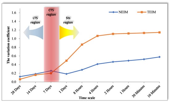 Variation coefficient is a very valid parameter, which can compare the dispersion degree of two groups of data based on eliminating the influence of scale and dimension. Firstly, the dispersion degree will be smaller if the variation coefficient is smaller. Secondly, if the variation coefficients of two groups of data are similar, it indicates that they have the same dispersion degree. In this paper, the variation coefficient has been selected to compare the calculation results of TEIM and NEIM at different time scales (as shown in Figure 4).