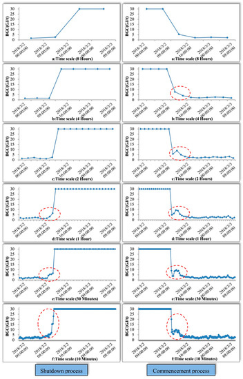 We further analyzed area I in Figure 5d, that is, the two fuchsia parts. There is a transition process from normal production to shutdown (shutdown process) and from shutdown to normal production (commencement process). However, at an LTS (such as the ‘1 day’ time scale), the performance of the transition process is not obvious. In order to be more familiar with this transition process, it should be carried out at a smaller scale. Therefore, the shutdown process and commencement processes of case-reheating furnaces are all shown at different STSs (‘8 h’, ‘4 h’, ‘2 h’, ‘1 h’, ’30 min’, and ’10 min’ time scales), as shown in Figure 6.