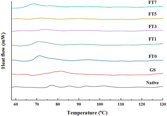 Thermal properties of ginger starch with native and different treatments. All values are the mean ± SD (n = 3). Native: unmodified starch; GS: ginger starch gelatinized at 100 °C for 20 min; FT0: ginger starch untreated with freeze–thaw; FT1: ginger starch treated with first freeze–thaw cycle; FT3: ginger starch treated with third freeze–thaw cycle; FT5: ginger starch treated with five freeze–thaw cycle; FT7: ginger starch treated with seventh freeze–thaw cycle.