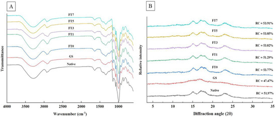 FTIR spectra (A) and X–ray diffraction pattern (B) of ginger starch with native and different treatment. All values are the mean ± SD (n = 3). Native: unmodified starch; GS: ginger starch gelatinized at 100 °C for 20 min; FT0: ginger starch untreated with freeze–thaw; FT1: ginger starch treated with first freeze–thaw cycle; FT3: ginger starch treated with third freeze–thaw cycle; FT5: ginger starch treated with five freeze–thaw cycle; FT7: ginger starch treated with seventh freeze–thaw cycle.