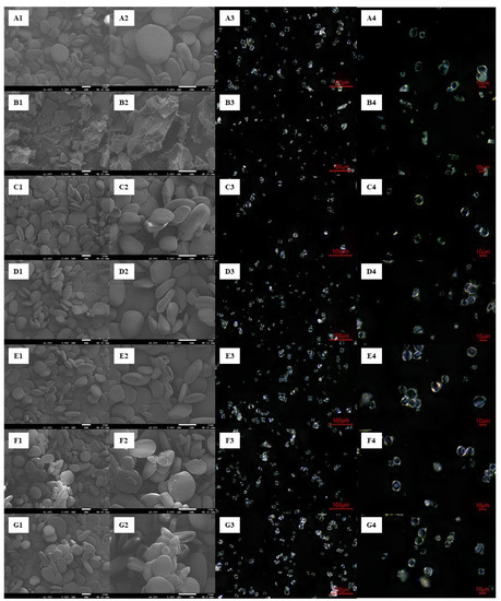 SEM images (1000×: (A1–G1);2000×: (A2–G2)) and polarizing light microscope graphs (100 µm: (A3–G3); 10 µm: (A4–G4)) of ginger starch with native and different treatment (A: Native; B: GS; C: FT0; D: FT1; E: FT3; F: FT5; G: FT7).