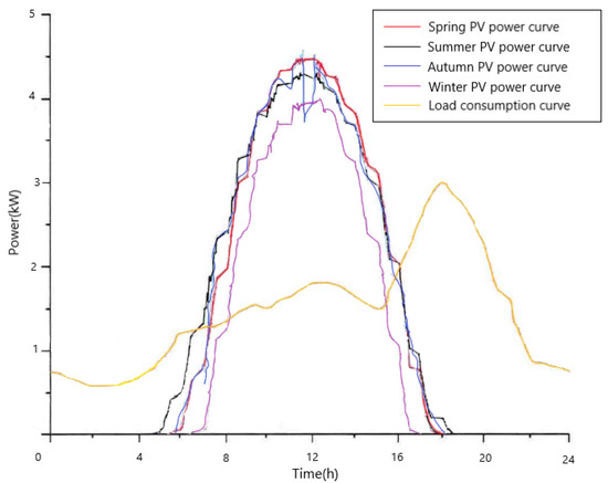 According to data from the National Energy Administration, China’s PV capacity reached 54.88 million kilowatts in 2021, its highest in recent years. A total of 25.6 million kilowatts were generated by PV power stations and 29.28 million kilowatts were from distributed PV systems. PV power generation technology has become a dominant force in the field of new energy generation. With the introduction of poverty alleviation policies, an increasing number of PV power generation systems have been integrated into rural distribution networks. The quality of power in the rural power grid can directly affect the user’s experience in electricity consumption. In China, due to its vast territory and wide distribution of residents, the load is dispersed, and the seasonality of electricity consumption has obviously caused a large peak–valley difference, which makes the rural power grid is extremely prone to over-voltage problems. However, the weak infrastructure [20], among other factors, poses a significant challenge to rural grids by exacerbating over-voltage problems [21] that occur due to the increase in PV power generation systems. To address this issue, it is necessary to first conduct a brief analysis of the power generation curve of a PV power system connected to a rural network and assess the power consumption load of the grid. The practical insights obtained by this analysis provide the foundation for dealing with the over-voltage problem effectively.