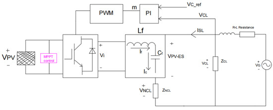 Firstly, the difference between the reference voltage (VCL_ref) and the actual measured critical load voltage (VCL) is input into PI, and the PI controller transforms the voltage value with less deviation to determine the modulation factor m (Equation (3)). Secondly, the PWM generator is adjusted to generate a high-quality pulse wave at a rated frequency. Then, the output voltage Vi of the half-bridge inverter circuit is generated by the inverter. Finally, the LC output filter is used to generate the PV-ES voltage (VPV-ES) with adjustable amplitude. The PV-ES mathematical model and Vi are as follows: