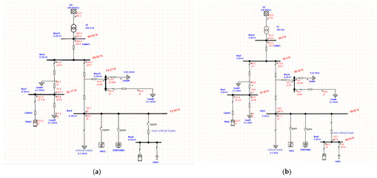 The data from Table 2 were used to test the PV-ES simulation model. The power supply was introduced at values within a small range of fluctuations, 0.2~0.4 s, so that they could be compared with fluctuations in the critical load, non-critical load, grid, and PV-ES voltages (Figure 12 and Figure 13). These figures confirm that voltage fluctuations are stabilized when PV-ES is incorporated into the system, and further confirms the effectiveness of the PV-ES configuration and the accuracy of the experimental results.