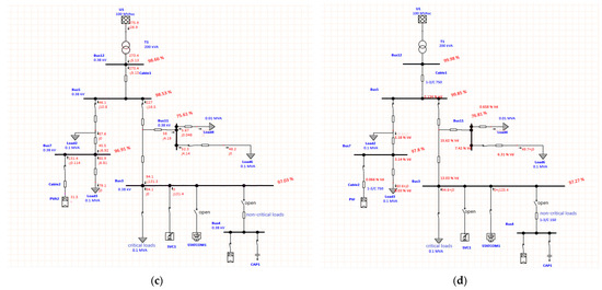 (a) No compensator access to the grid; (b) PV-ES access to the grid; (c) SVC access to the grid; (d) STACOM access to the grid.
