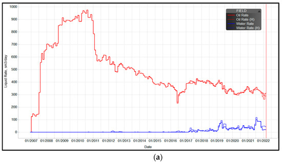 Because of the high uncertainty of fractured-vuggy reservoir parameters, the reservoir parameters should be reflected with dynamic response characteristics via many iterations and fitting. After the division, 255 × 254 × 100 meshes with the same size of 15 × 15 × 5 m were generated. The total number of meshes was 6,477,000. After 56 iterations in two rounds on the established model of the intersection region of the S99 unit, the overall fitting ratios of regional production, single-well production, and flowing bottomhole pressure (FBHP) were approximately 85%, as shown in Figure 5.
