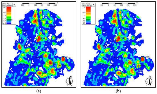 The geological parameters of the reservoir were further determined. First, the porosity was measured and corrected based on static and dynamic reserve data. Then, by considering the convergence of numerical simulation, the porosity model was smoothed by 4 × 0.5 times. Results show that the porosity degrees of core and non-core caverns were 19% and 3.8%, respectively. For the modified model, the geological reserves were 18.59 million tons, with an error of 2.3%. Figure 2 displays the abundance graph of original reserves in the intersection region.