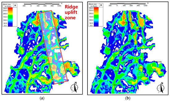 At the initial stage of development, the reservoir bodies in the intersection region of the S99 unit showed strong connectivity, and the reservoir had a uniform oil-water interface. Initially, the oil-containing thickness was mainly subjected to construction, and the remaining oil accumulated in the ridge-uplifting belt, as shown in Figure 12. With the gradual deepening of the development degree, the oil-containing thickness in the reservoir dropped gradually, and the mean value dropped was initially 106 m to currently 82 m. Additionally, oil-containing thickness in the southern high-production wells dropped most significantly.
