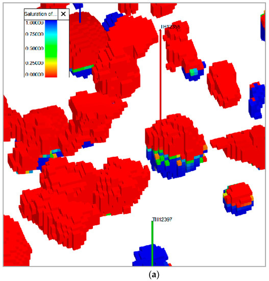 In addition, the permeability showed high uncertainty. Different types of reservoir bodies were assigned with different values. Specifically, the permeabilities of core caverns, non-core caverns, and fractures were 2000 mD, 800 mD, and 60 mD, respectively. Figure 3 displays the permeability distribution pattern in the intersection region of the S99 unit.
