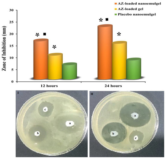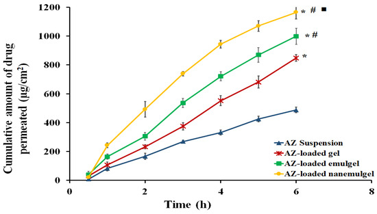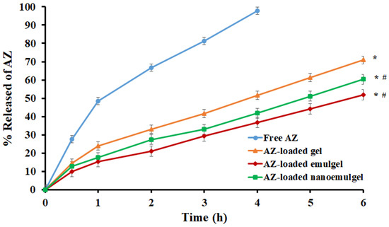 | AZ-loaded emulgel | 176.95 ± 4.38 *,# | 2.06 ± 0.11 *,# |