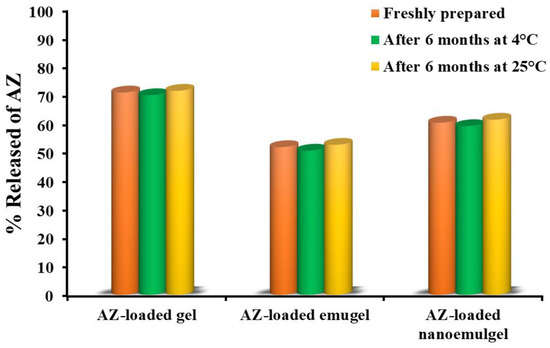 | AZ-loaded gel | White homogenous | 60.67 ± 1.53 | 72,100 ± 1418 | White homogenous | 62.67 ± 1.15 | 71,000 ± 1127 |