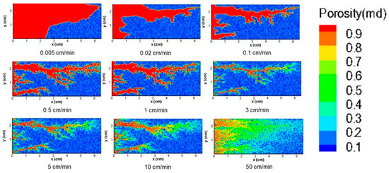 As mentioned above, the optimal injection rate range for foamed-VES acidizing is from 1 cm/min to 5 cm/min. Therefore, numerical simulations were conducted using an injection rate of 2.5 cm/min while holding other parameters constant. Figure 6 shows the acid wormhole morphology under different porosity distribution patterns. Figure 6a shows the final acid wormhole morphology under a random porosity distribution pattern. It can be seen that multiple wormholes grow and develop simultaneously at the initial stage. After competing with each other, only three wormholes continue to grow and extend, and one of them breaks through the rock core with an absolute advantage in propagation. This wormhole consumes 0.44 PV of acid fluid during core breakthrough, and the dissolution mode is a typical dominant wormhole morphology. Figure 6b shows the final acid wormhole morphology under a spatially correlated porosity distribution pattern, where the extension and propagation of wormholes are similar to those under a random porosity distribution pattern. Similarly, at the initial stage, multiple wormholes grow and extend simultaneously, and a few wormholes continue to expand after competing for advantages. However, as porosity distribution has some correlation in the X-direction, which is favorable for acid flow in the X-direction, the dominant wormholes can extend and expand simultaneously instead of only one wormhole expanding until a breakthrough. Therefore, compared to the random porosity distribution pattern, the volume of acid fluid consumed during wormhole breakthrough increases significantly. Figure 6c shows the final acid wormhole morphology based on the actual rock core pore space distribution. At the initial stage, only a few wormholes grow and extend simultaneously in areas with larger initial porosity, which is different from the growth pattern of wormholes under the other two distribution patterns. This is because the porosity distribution of the actual rock core is significantly more heterogeneous. As acid fluid is continuously injected, one wormhole gains an absolute advantage and extends forward after competing with others. Obviously, it will communicate with the areas with larger initial porosity during the extension process, thus changing the propagation path of the wormhole. Finally, this wormhole consumed 0.48 PV of acid fluid during core breakthrough, and its dissolution mode was typical of a dominant wormhole morphology.