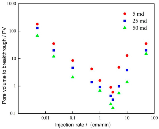 The relationship between injection rate and PVbt under different initial permeabilities.