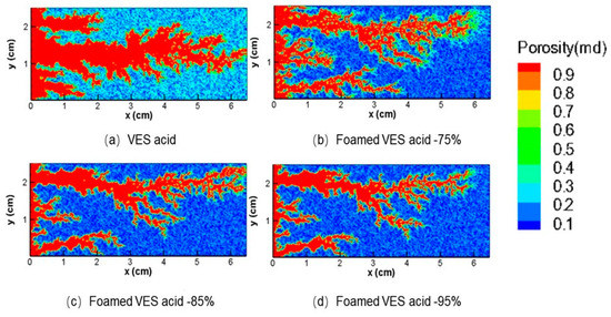 Figure 13 displays the final acid wormhole morphology in high- and low-permeability reservoirs during general acidizing using foamed-VES acid and VES acid under different permeability levels. During the acidizing treatment of VES acid, the acid solution preferentially enters the layer with low seepage resistance, and the high-permeability layer is preferentially transformed. As the acid rock reaction produces Ca2+ ions, VES forms wormlike micelles, sharply increasing the viscosity of the acid solution and forcing the subsequent acid solution to turn towards the low-permeability layer. This self-viscosifying property of VES facilitates uniform acid distribution. However, the initial permeability difference of the reservoir can cause acid fluid to flow into the high-permeability layer, and the stimulated degree of the low-permeability layer depends on the relative strengths of VES’s self-viscosity increasing effect and the permeability contrast effect.
