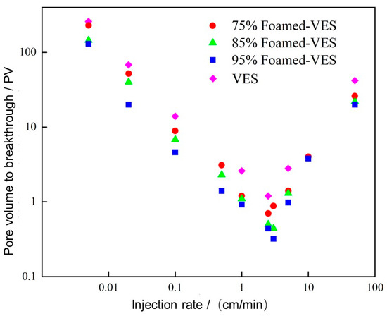 The relationship curve between injection rate and PVbt for VES acid and foamed-VES acid with different foam quality.