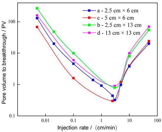 Numerical simulations were performed at different injection rates using models of varying sizes, and the relationship between injection rate and PVbt is shown in Figure 12. Firstly, it can be observed from the figure that the optimum injection rate range remains nearly constant for the models of different sizes. Secondly, comparing models a (2.5 cm × 6 cm) and c (5 cm × 6 cm), the curve shifts downward and to the right when the injection rate is below the optimum injection rate while holding the core length constant and increasing its width. The underlying reason is that as the core width increases, the pore volume must also increase. However, the volume of acid consumed changes only slightly, meaning that under low injection rate conditions, the PVbt is inversely proportional to the core width. When the injection rate is higher than the optimum value, the convection effect is far stronger than the diffusion effect, causing the acid solution to move to the far end without sufficient reaction time before breaking through the core, resulting in little change in the PVbt under high flow rate conditions. Likewise, comparing models b (2.5 cm × 13 cm) and d (13 cm × 13 cm), a similar trend is observed, again verifying the previous conclusion. When comparing models a (2.5 cm × 6 cm) and b (2.5 cm × 13 cm), where the width remains constant while the length doubles, it is clear that the PVbt consumed by the latter is always higher, regardless of whether the injection rate is below or above the optimum value. Although the length increases, the pore volume increases, and the amount of acid consumed to form wormholes also increases significantly. As a result, the PVbt presents an overall upward trend.