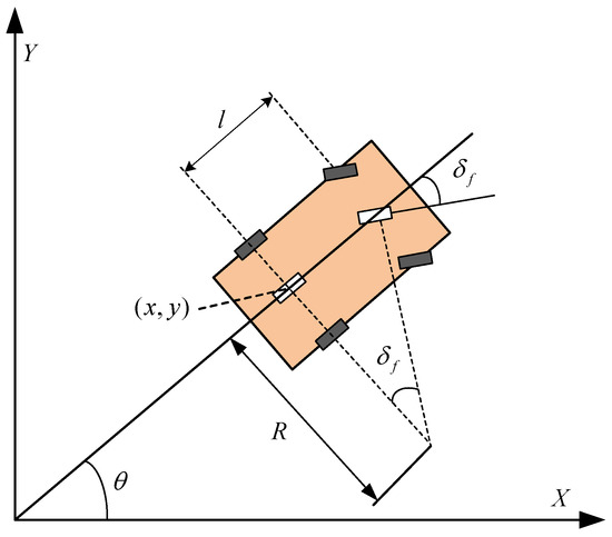 In vehicle path planning, it is necessary to consider the kinematic characteristics of the vehicle itself to ensure that the planned path meets the kinematic constraint conditions of the vehicle. This ensures that the planned path can meet the vehicle’s steering motion characteristics, thereby ensuring the stability and safety of the driving process. The vehicle kinematic model established in this paper is shown in Figure 1.