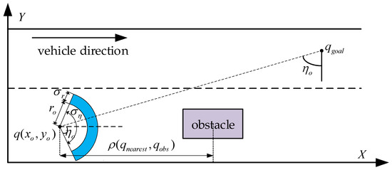 As shown in the coordinate system in Figure 3, vehicles need to move in the direction of the lane markings while avoiding obstacles represented by the black box. Depending on the driving intent of the vehicle, the RRT* algorithm should focus more on sampling in front of the vehicle during random sampling. Therefore, the Gaussian sampling will be more consistent with actual driving behavior. Using the state space information around the current nearest node, the sampling area of the new random node is limited to an adaptive fan-shaped range along the X-axis direction of the nearest node, as shown in Equation (3):