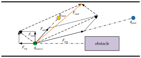 Based on the Goal Biased RRT*, an improved APF method is combined, where both the target point and random sampling point exert attraction on the nearest node, and obstacles exert a repulsive force on it. At the same time, considering the road environment where the autonomous driving vehicle is located, the road boundary repulsive force is introduced. The force diagram of the nearest node is shown in Figure 5, and the direction of the resultant force is drawn using the parallelogram rule, as shown in Equation (16). Its direction serves as the extension direction for new nodes, controlling the growth of the random tree towards the target point to reduce randomness and accelerate path search speed.