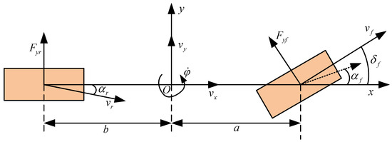 where is the mass of the entire vehicle; and are the lateral forces of the front and rear wheels, respectively; is the rotational inertia of the vehicle around the Z-axis; is the vehicle’s yaw rate; and are the distances from the center of mass of the vehicle to the front and rear axles, respectively, and are the lateral stiffness of the front and rear wheels, respectively; is the longitudinal speed of the vehicle; is the lateral velocity of the vehicle.