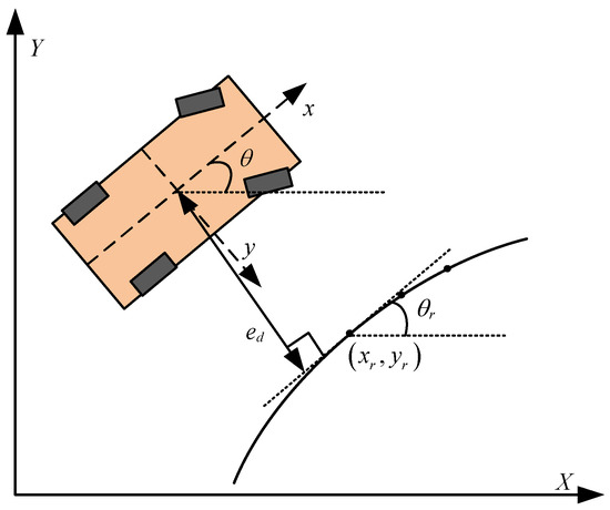 When an autonomous vehicle is tracking a reference path, it will mainly experience lateral error and heading angle error. As shown in Figure 8, the shortest distance between the vehicle’s center of mass and the reference path projection point is defined as the lateral error . The difference between the vehicle’s actual heading angle and the reference heading angle is defined as the heading angle error . For convenience of calculation, it is assumed that the vehicle’s center of mass has a lateral deviation angle , and the vehicle’s heading angle error is . In actual control, the controller is required to eliminate these two errors in real time to enable the vehicle to track the planned path in real time. Based on the lateral error and heading angle error, the first-order derivatives of lateral error and heading angle error can be calculated.