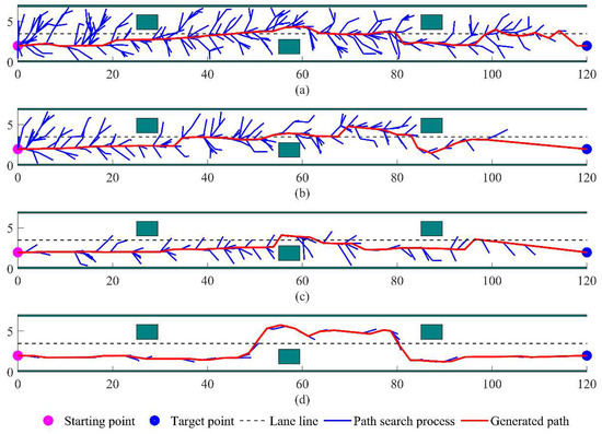 Map 1 depicts a two-lane changing scenario where the vehicle must avoid three obstacles on the right lane and switch to the left lane. As shown in Figure 11a, the original RRT* algorithm employs full-state space random sampling, generating unnecessary sampling processes and resulting in a longer and more tortuous path. Figure 11b displays the simulation results of the Goal-Biased-RRT* algorithm, which significantly reduces the sampling process and improves the search efficiency by incorporating a target bias strategy. Figure 11c shows the simulation results of the P-RRT* algorithm, which enhances search speed and simplifies redundant nodes by adding attractive field constraints. However, it still generates redundant nodes around obstacles due to the lack of obstacle exclusion effect. In contrast, Figure 11d illustrates the Improved-RRT* algorithm, which restricts the variable sampling area and introduces an improved APF algorithm to enhance search efficiency. Although the path length of the Improved-RRT* algorithm does not show a significant advantage compared to the previous algorithms, the distance between the path and obstacles has a certain safety margin, thus improving the path safety.